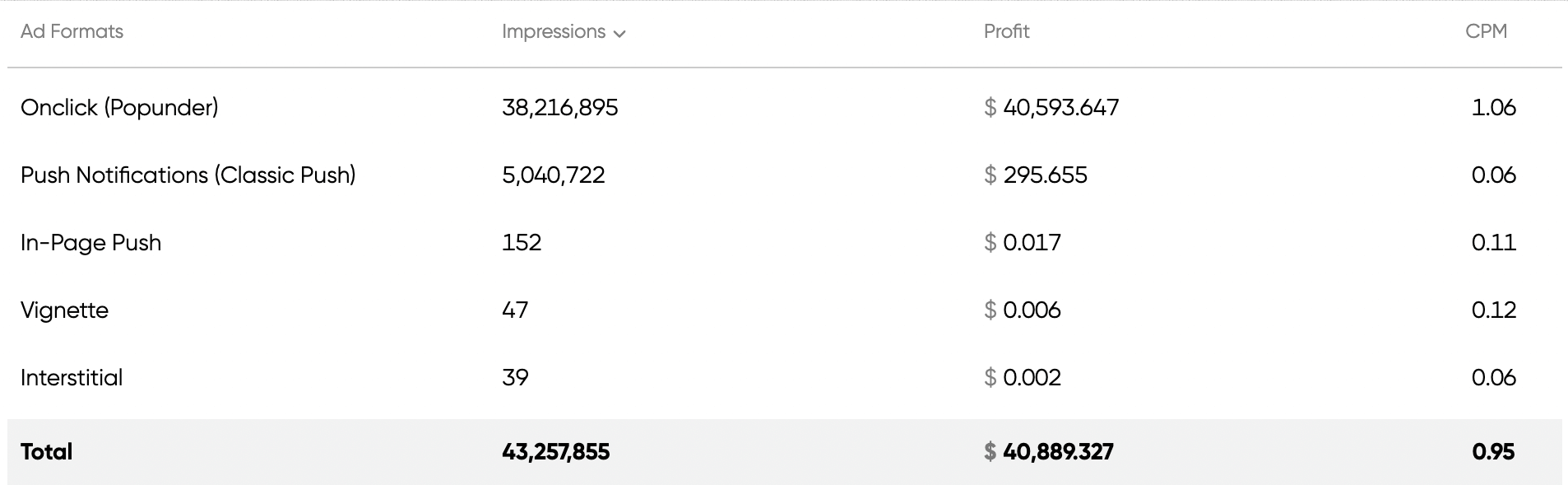 Our publisher uses Popunder and Push ads on his website. However, as he shared, Popunder was the most effective format for him, and the stats confirm it: