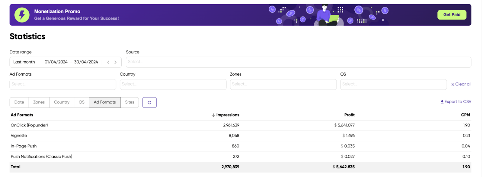 As you can see, our publisher’s site is a perfect match for Popunder ads. As it generates more profit than the other formats, the partner picked it as the main monetization option.