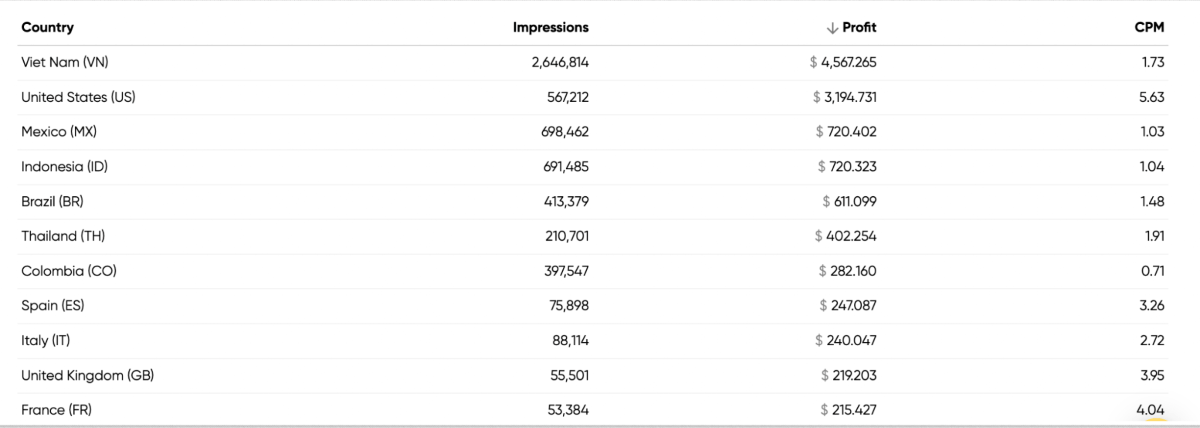 And this shows how various GEOs perform. As Phong shared, he usually targets Asian and American countries because users there are more engaged than those in Europe or other continents: