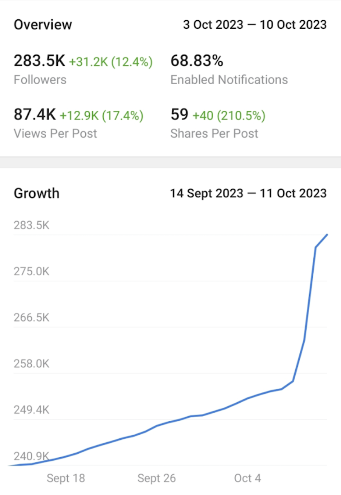 Also, in less than a month (September-October 2023), he had a significant growth in traffic – from 240.000 to 280.000+ channel subscribers: