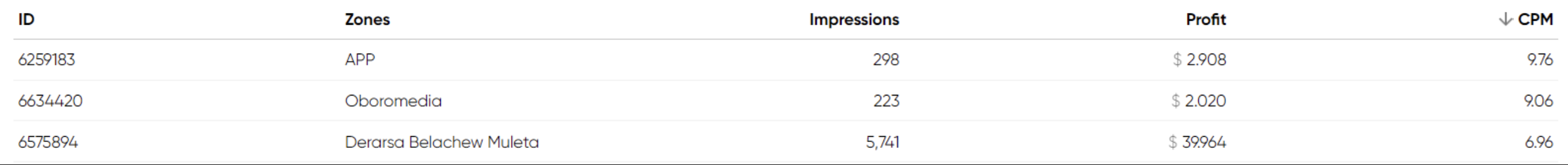 And here are the statistics for only several zones of his SmartLink. The publisher added the link under every post on his Telegram channel, and they showed different results: