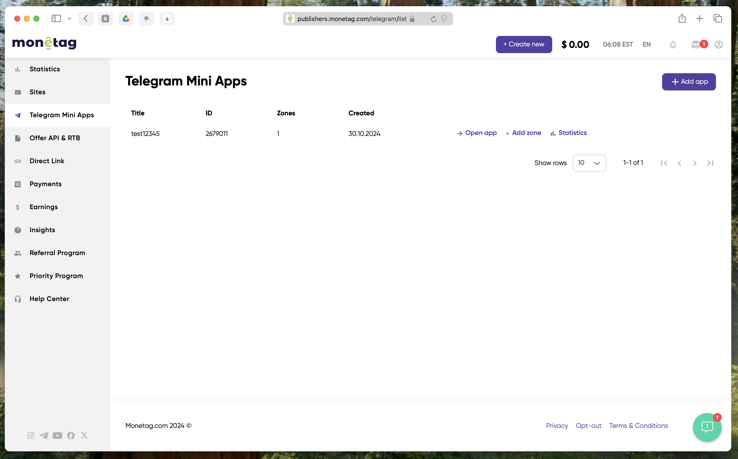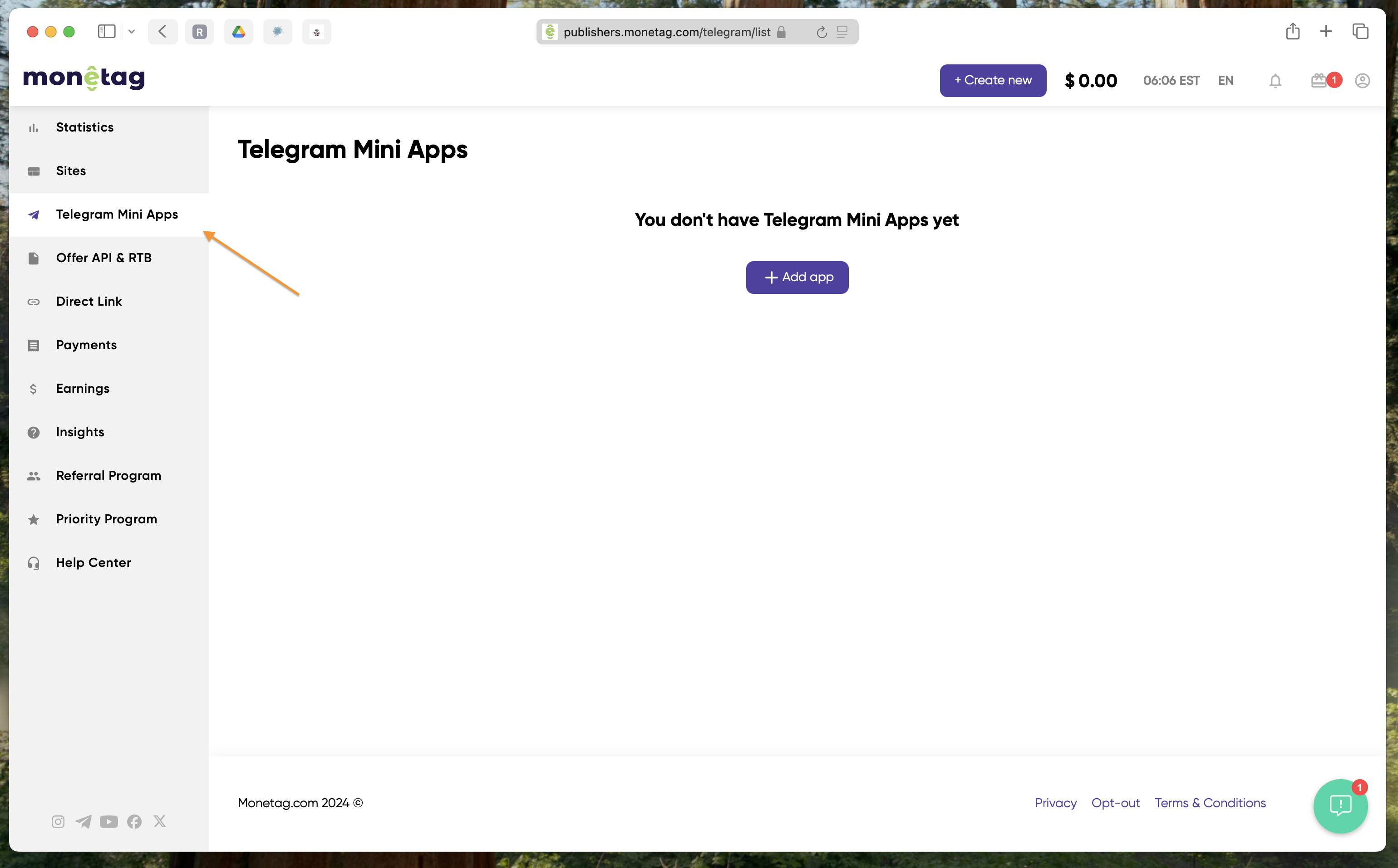 To start monetizing your Telegram Mini App, log in to your Monetag platform and click on the “Telegram Mini App” tab in the left menu. Then, add the URL of your Telegram app by clicking the “Add App” button.